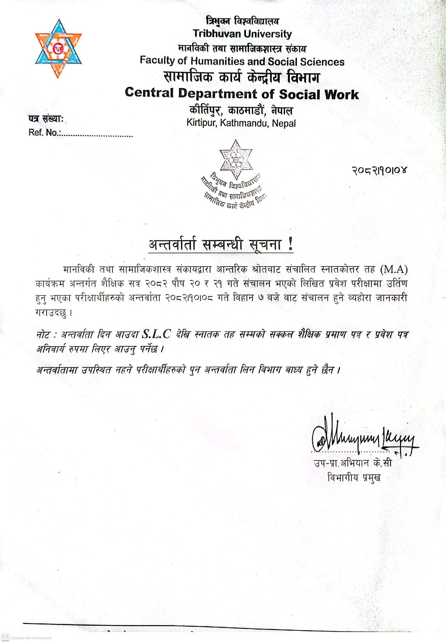 Dear all students, who have passed MSW entrance 2025 do follow the notice for interview: date, time and venue. Additional notice of time schedule will be notified soon.
